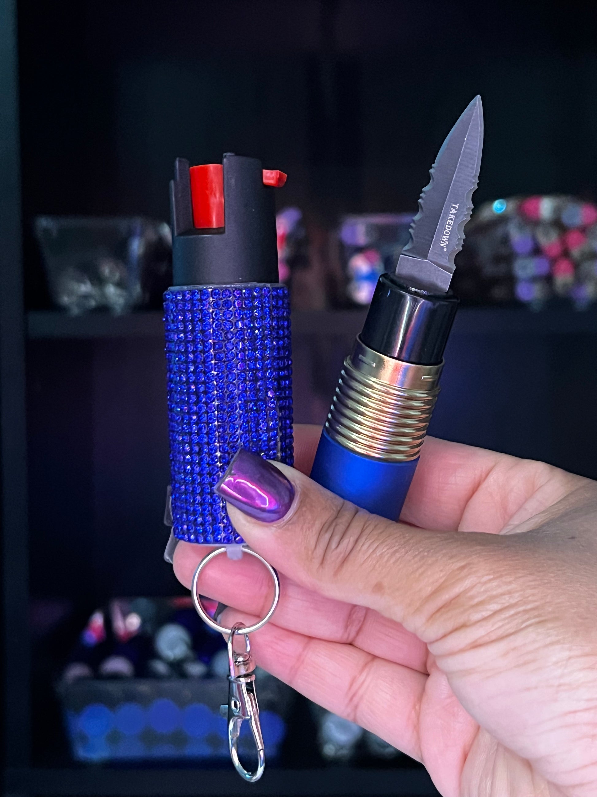 Bundle our pepper spray and lipstick that also contains a hidden knife. This includes features like a removable cap, and twisting mechanism to resemble the appearance of real lipstick. These items are compact and lightweight, making it easy to carry in a purse, make-up bag, pocket or keychain without drawing attention.
