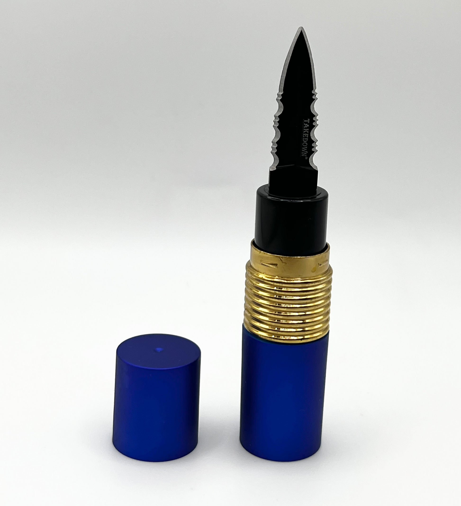 This discreet and stylish lipstick also contains a hidden knife for added self-defense capabilities. This includes features like a removable cap, and twisting mechanism to resemble the appearance of real lipstick. The tool is compact and lightweight, making it easy to carry in a purse or make-up bag without drawing attention.